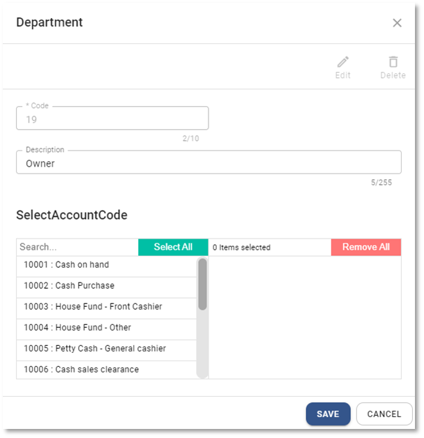 - Select Account code > ใช้กำหนดรหัสบัญชีที่สามารถใช้คู่กับแผนกได้ เช่น แผนก Front Office สามารถใช้ได้เฉพาะ Account code ในหมวดรายได้ค่าห้องเท่านั้น จะช่วยป้องกัน user เลือก Account code ผิดแผนกได้