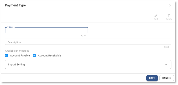 Function นี้ใช้สำหรับบันทึกประเภทการชำระเงินเพื่อนำไปใช้กับ Payment ของเจ้าหนี้ Vendor และบันทึกประเภทการรับชำระเงินเพื่อนำไปใช้กับ Receipt ของลูกหนี้ AR