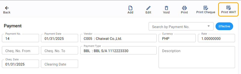 - Note: For our users in the Philippines, we have added a dedicated "Print WHT" button directly on the payment screen. This update makes it much faster to generate withholding tax documents (BIR Form No. 2307) right when you process your payments.