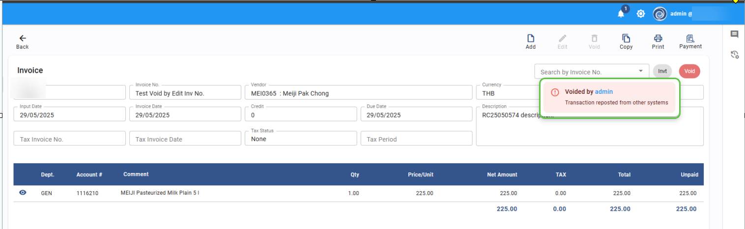 Account Payable - Invoice - Add void comment if void by posting from Receiving