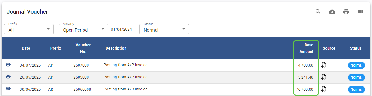 General Ledger - Journal Voucher - Show JV total Base amount in JV List screen