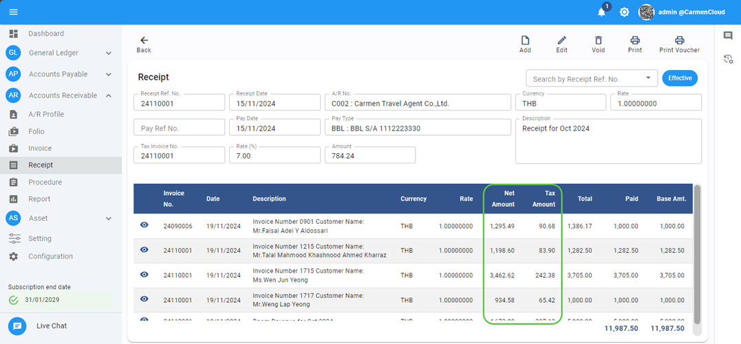 Account Receivable - Receipt – shows invoice net amount and tax amount