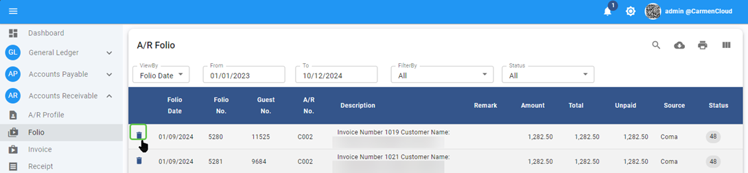 Account Receivable - Folio - allow to void/delete folio which not use
