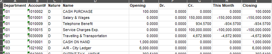 General Ledger - Report - Trial balance - show department code when export