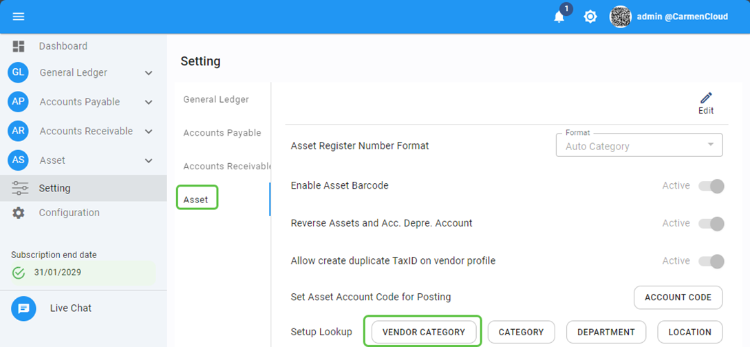 - Note : allow user to maintain vendor category through Asset setting