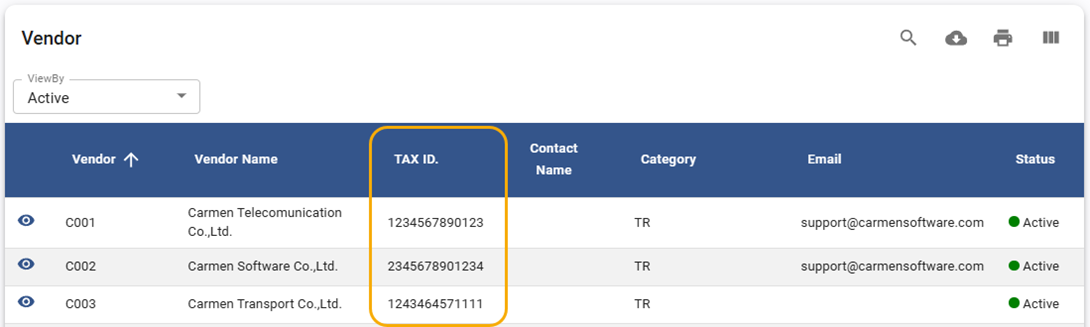 - Note: For faster referencing and verification, the Vendor Tax ID is now directly displayed on the Vendor List screen.