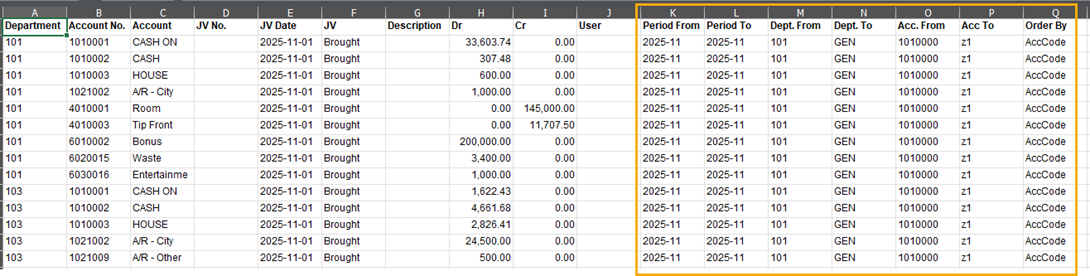 - Note: When exporting the Account Detail report, the file now includes the report parameters used to generate the data, providing better context and traceability for your reports.