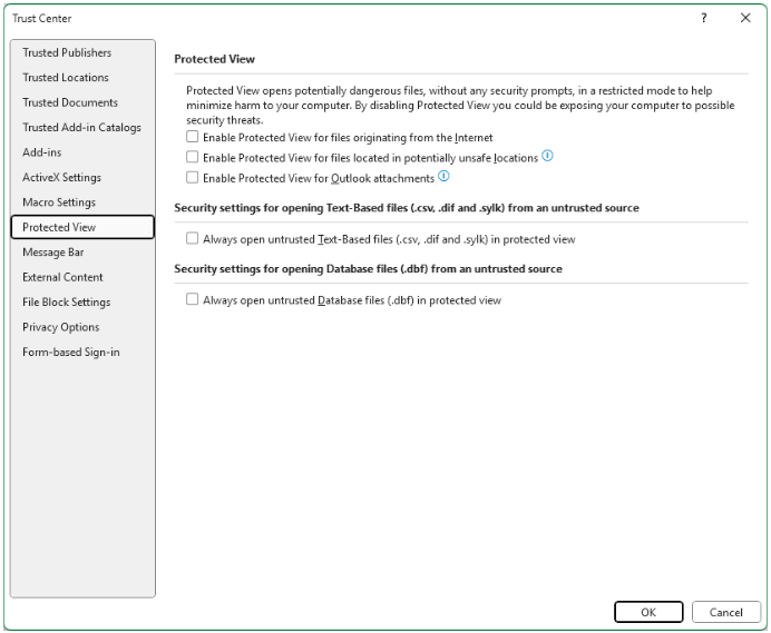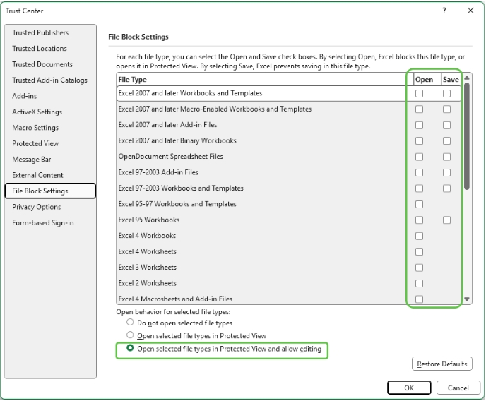 5.5.2.ให้เลือกเป็น Open Selected File types in Protected View and allow editing